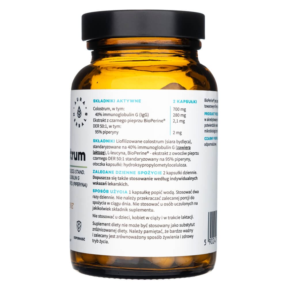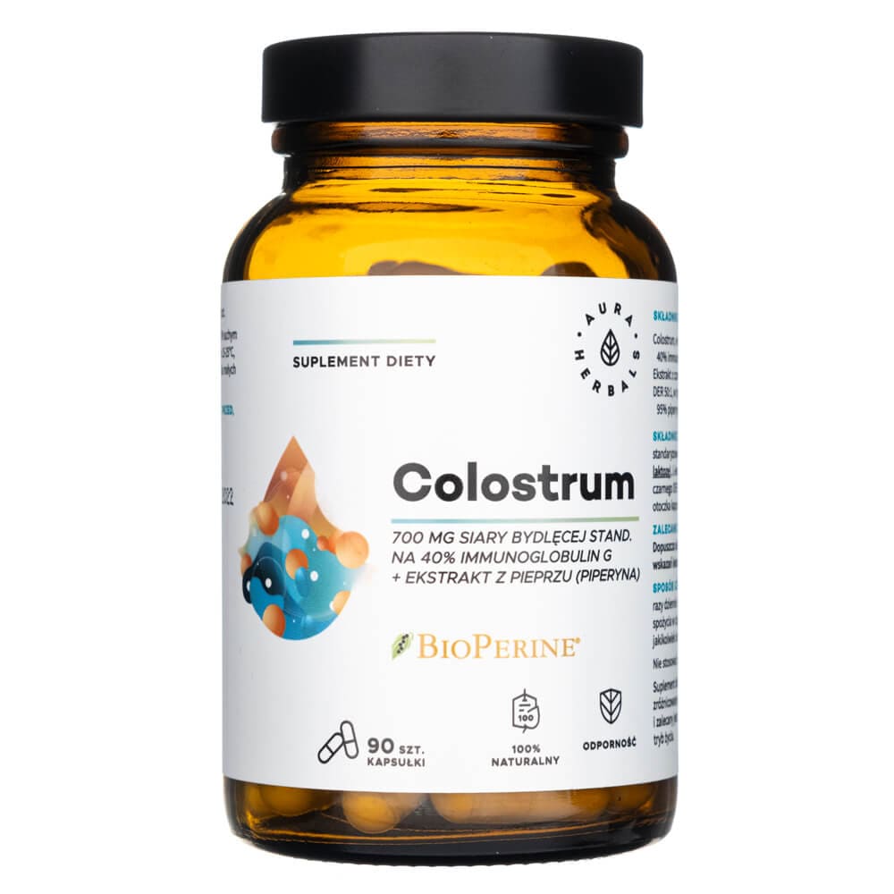 Colostrum är ett kosttillskott i kapslar från Aura Herbals, som innehåller 700 mg bovint Colostrum standardiserat till 40% immunoglobulin G, med tillägg av märkes BioPerine ® svartpepparextrakt standardiserat till 95% piperin. Svartpepparn i tillskottet hjälper matsmältningen och näringsupptaget, och förbättrar effektiviteten hos andra växtbaserade ingredienser.