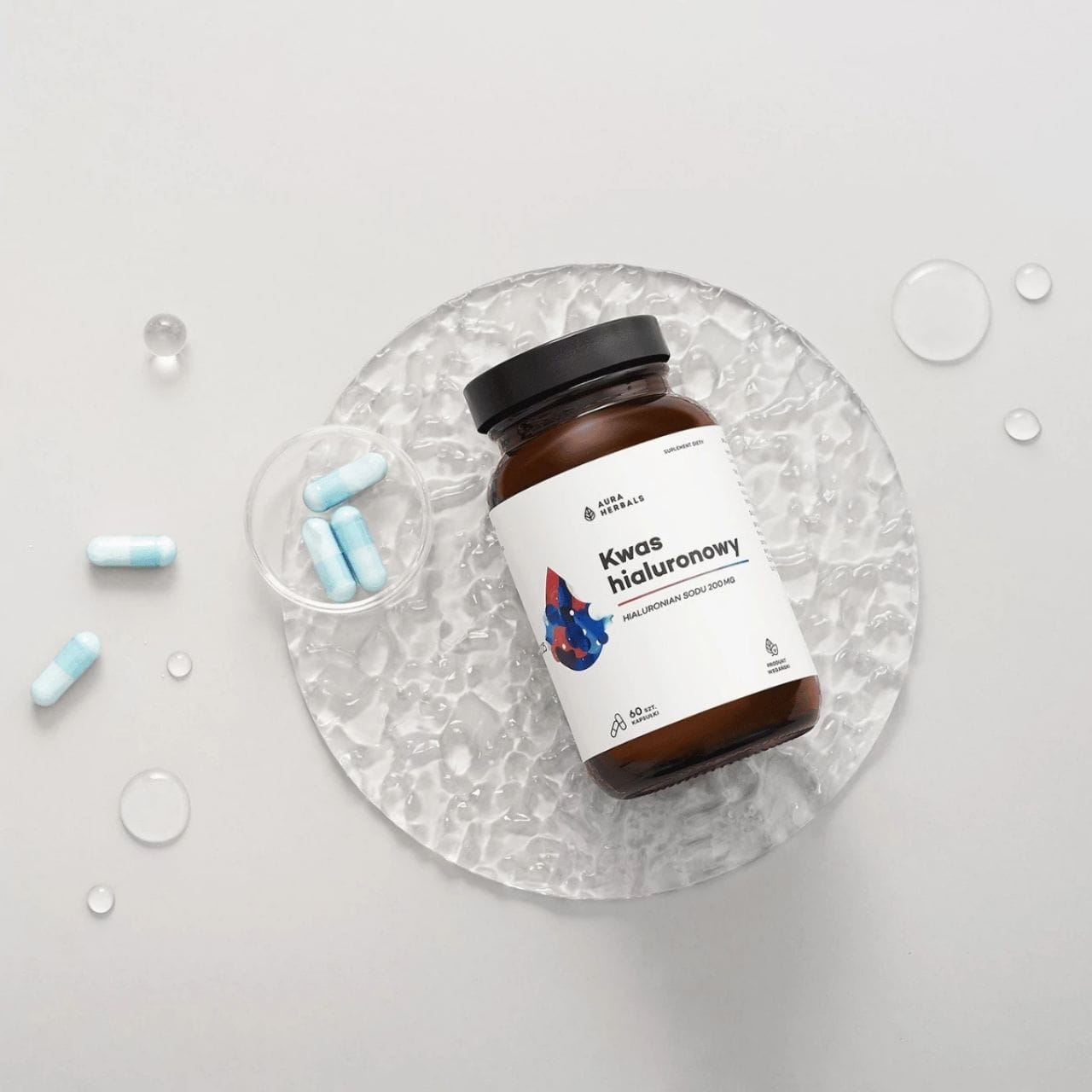 Aura Herbals Hyaluronic Acid is a dietary supplement in HPMC capsules providing 200 mg of sodium hyaluronate in a single daily dose. Vcaps® capsules made of hydroxypropyl methylcellulose with natural spirulina colouring — 100% vegan. Clean label composition without unnecessary additives. Does not contain: gluten, lactose, gelatin, soy, GMOs, preservatives, artificial colours or sweeteners.