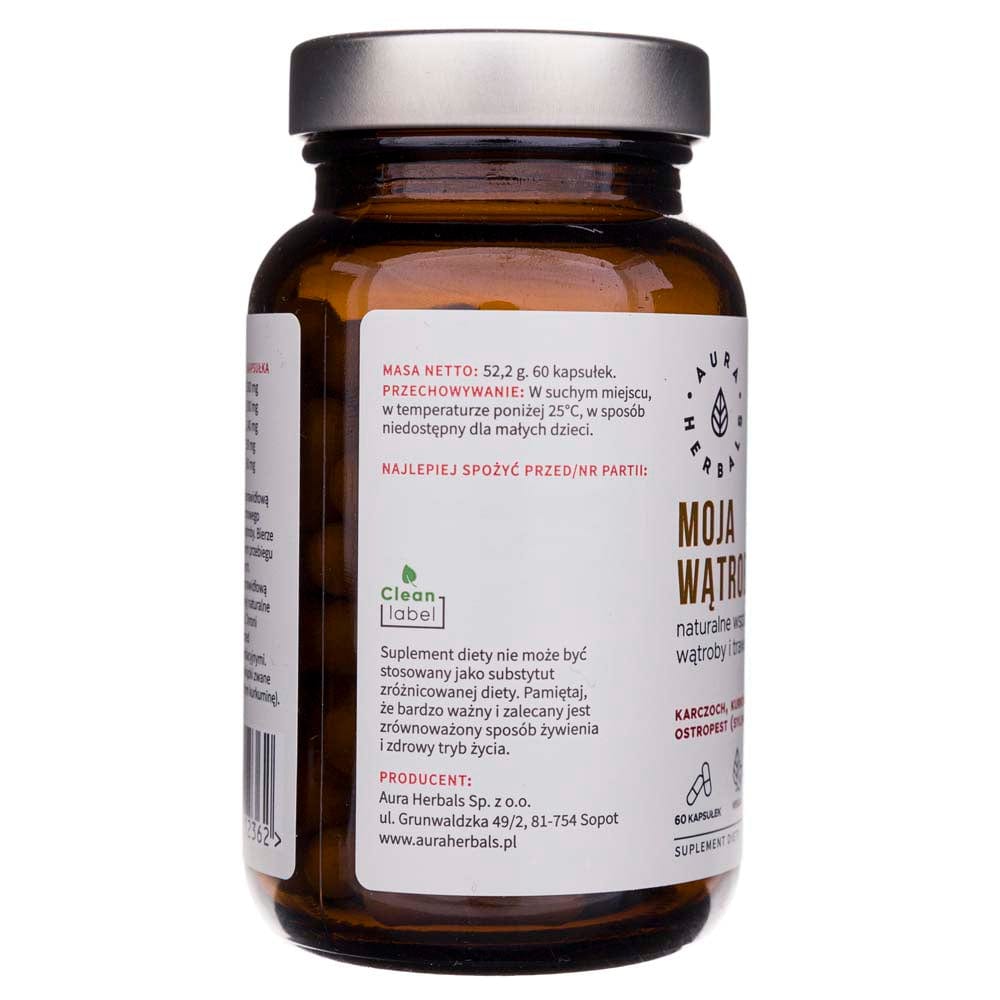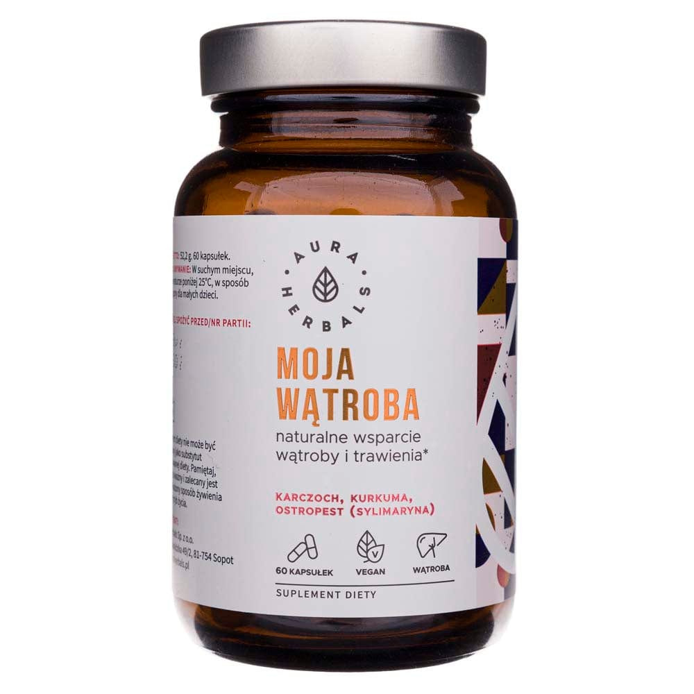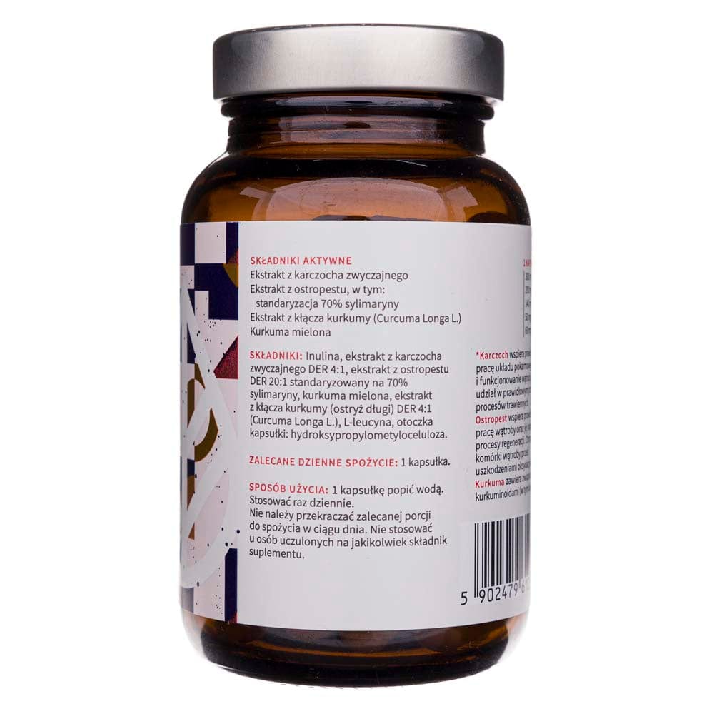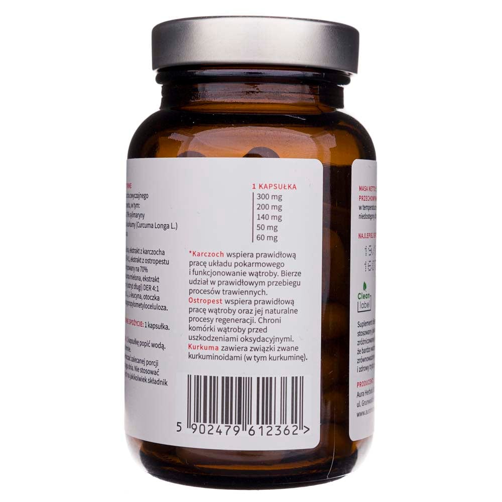 Kosttillskott i vegetabiliska kapslar från Aura Herbals innehållande kronärtskocka, mjölktistel och gurkmejaextrakt.