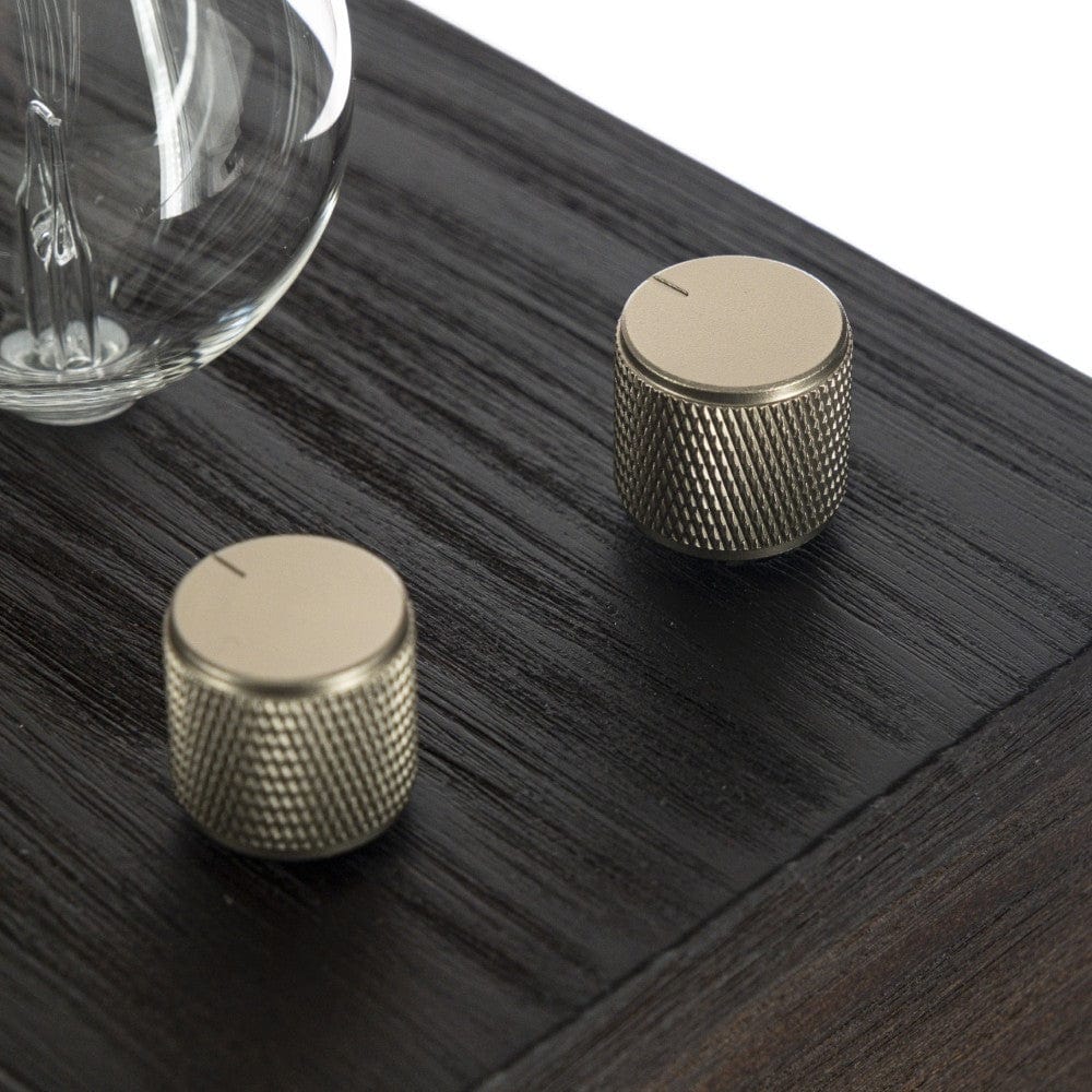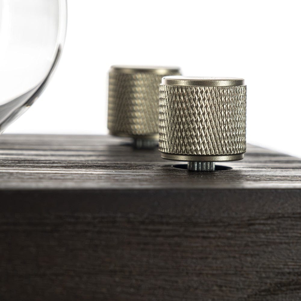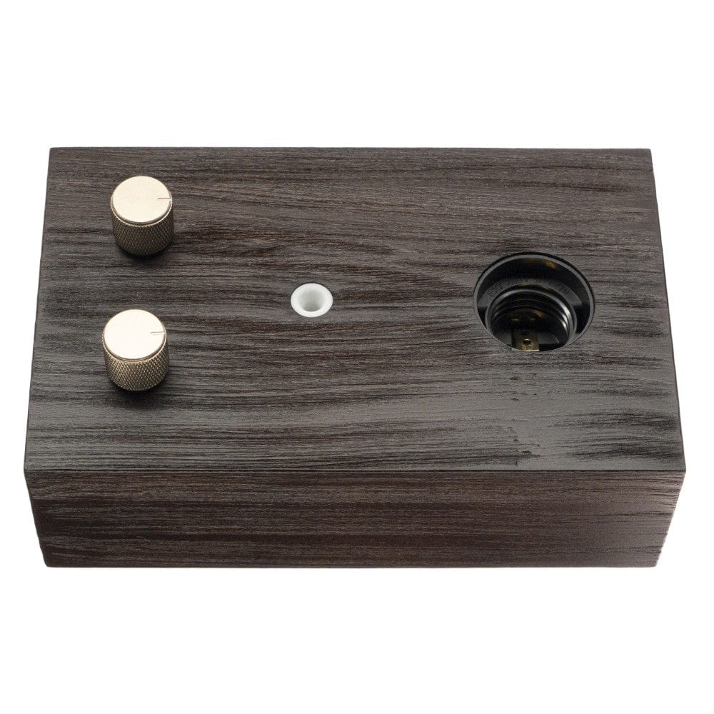 - En bas i furu, glasflaska , glödlampa och metallknoppar – hållbarhet och elegans i ett.