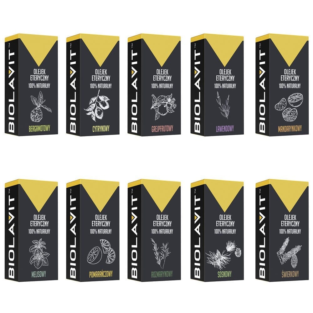 Set med 10 eteriska oljor från Bilovit. Setet innehåller bergamott, citron, grapefrukt, lavendel, mandarin, citronmeliss, apelsin, rosmarin, gran, och tallolja.