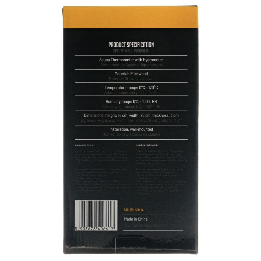 Bilovit termometer med hygrometer är en precis mätanordning för bastun, tillverkad av furu som inte blir varm under användning. Den mäter temperatur från 0 till 120 °C och luftfuktighet från 0 till 100%, så att du kan kontrollera optimala bastuförhållanden. Den minimalistiska designen passar in i alla typer av bastur, och fästet på baksidan gör att den kan monteras säkert på väggen. Perfekt för dig som värdesätter komfort och precision under bastun.