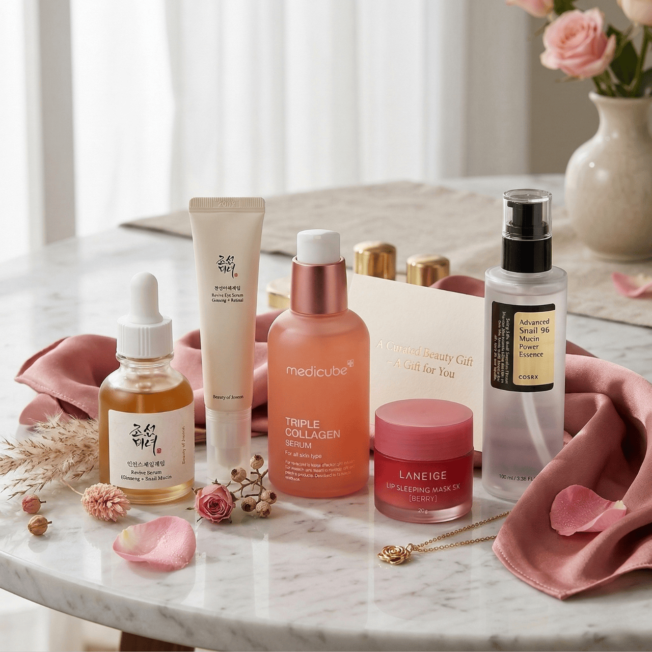 K-Beauty Anti-Aging-presentpaketet samlar fem högpresterande hudvårdsfavoriter som drivs av snigelmucin, ginseng, marint kollagen och peptider – några av de mest hyllade ingredienserna inom koreansk skönhet. Denna noggrant utvalda kvällsritual riktar in sig på synliga tecken på åldrande, och återställer fasthet, lyster och djup återfuktning till mogen hud.