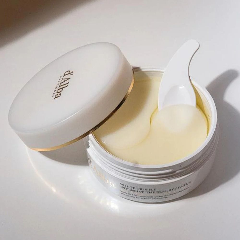D'alba White Truffle Intensive Eye Patch till lyxiga hydrogelögonplåster som innehåller 1,73 ppm vit tryffelextrakt och kollagen. Den innovativa formulan med fermenter och 7 naturliga växtoljor återfuktar intensivt, ljusar upp mörka ringar under ögonen och minskar fina linjer. Flexibel gelkonsistens fäster perfekt på huden, och frigör gradvis de aktiva ingredienserna. Efter 40-50 minuter blir,-plåstren genomskinliga, vilket indikerar att näringsämnena har absorberats fullständigt.