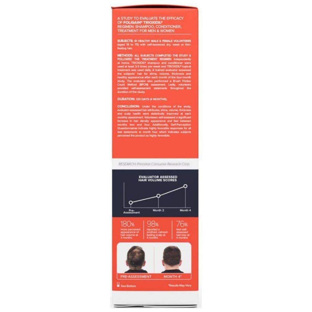 FOLIGAIN Shampoo representerar de senaste framstegen i kampen mot androgenetisk alopeci . Den viktigaste ingrediensen är det patenterade Trioxidil-komplexet i en koncentration på 2%, vars effektivitet har bekräftats i rigorösa kliniska studier. Resultaten är imponerande: 180% ökning av hårvolymen efter 4 månader, 76% minskning av håravfall under samma period, och 75% förbättring av hårets täthet efter bara 2 månaders användning.