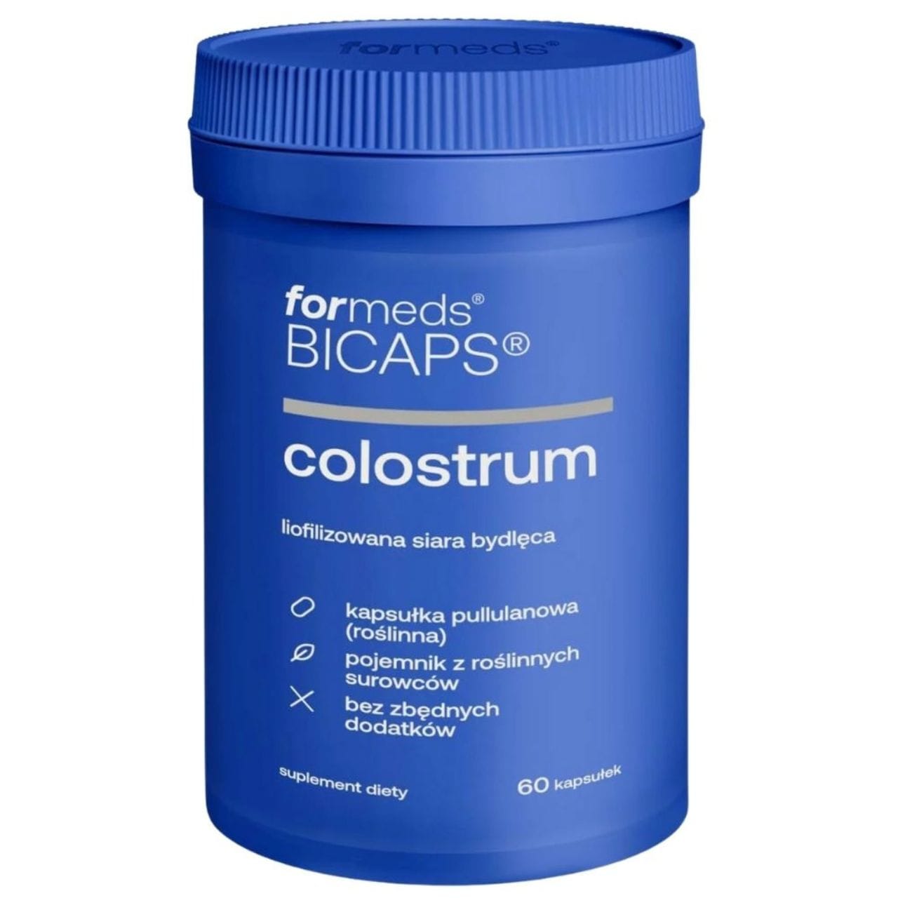 Formeds Bicaps Colostrum är ett kosttillskott i kapselform. Det är en källa till frystorkat bovint Colostrum, som erhållits inom de första 24 timmarna efter födseln. Detta säkerställer att det behåller sin fulla stabilitet och biologiska aktivitet. Colostrum standardiserat för immunoglobuliner (30%), laktoferrin (2,5%) och polypeptider rik på prolin (2%).