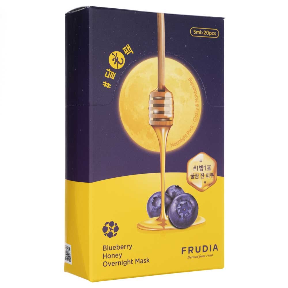 Frudia Blueberry Honey Overnight Mask är en närande, övernattningsmask baserad på återfuktande blåbärsextrakt som mjukgör, slätar ut och lugnar din hud. Dessutom är, denna produkt berikad med vårdande sheasmör och starkt återfuktande betain för att ge heltäckande vård. Setet innehåller 20 masker .