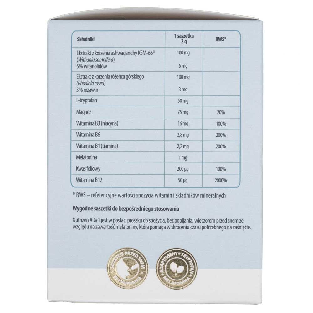Nutrizen AD 1 är ett kosttillskott som innehåller ett noga utvalt komplex av adaptogener, tryptofan och melatonin berikat med B-vitaminer och magnesium för att bidra till att bibehålla normala psykologiska funktioner, somna snabbare och minska trötthetskänslor.