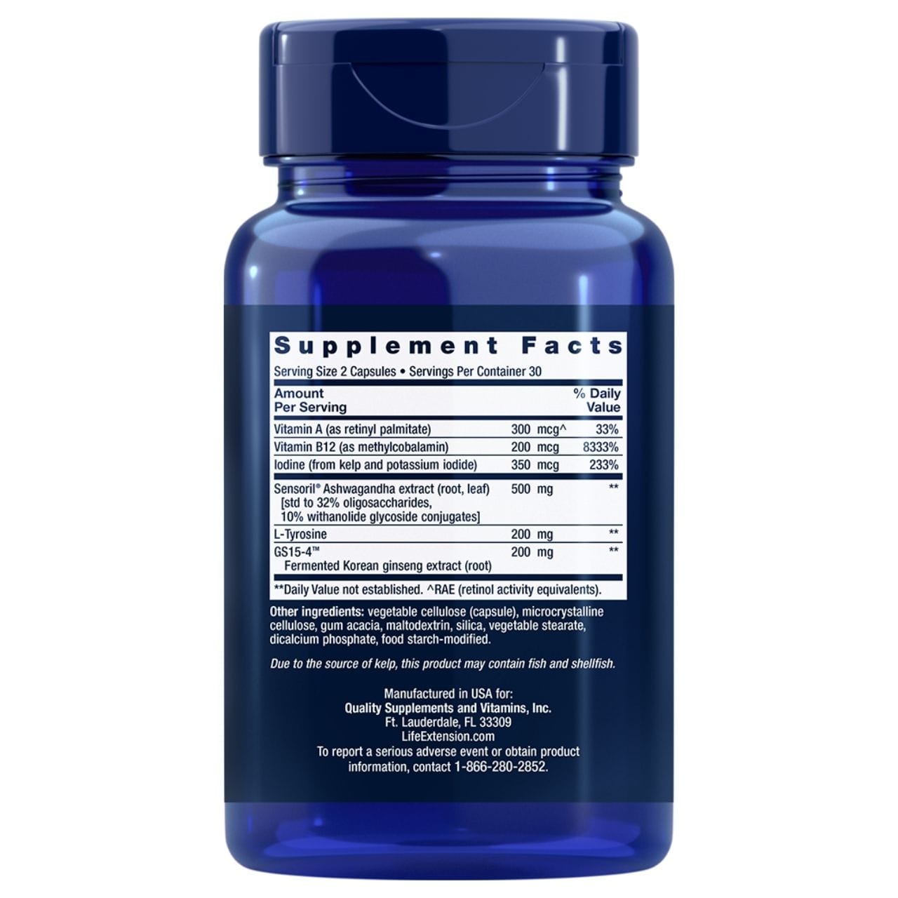 | Sensoril ® Ashwagandha-extrakt (rot och blad) [std. till 32% oligosackarider,10% konjugerade vitanolidglykosider]. | 500 mg | * |