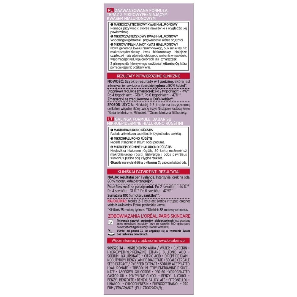 L'Oréal Paris Revitalift Filler Serum är ett koncentrerat ansiktsserum som innehåller tre typer av hyaluronsyra. Produkten återfuktar huden intensivt, slätar ut rynkor och förbättrar fastheten på bara 1 timme efter applicering. Avsedd för alla hudtyper, inklusive känslig hud.