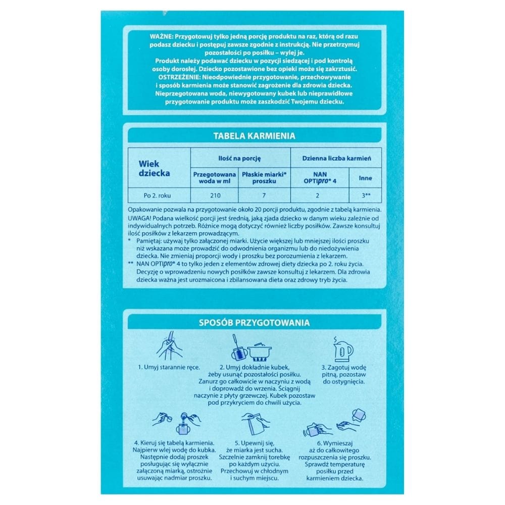 Nestle NAN OPTIpro 4 är en mjölkbaserad produkt avsedd för små barn över 2 år. Berikad med vitaminer och mineraler. Den ersätter inte bröstmjölk, utan är en produkt som är utformad för att underlätta en korrekt sammansättning av barnets kost.
