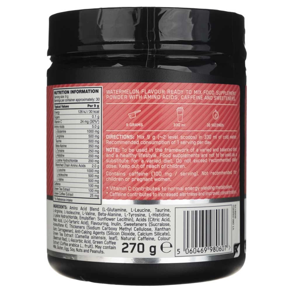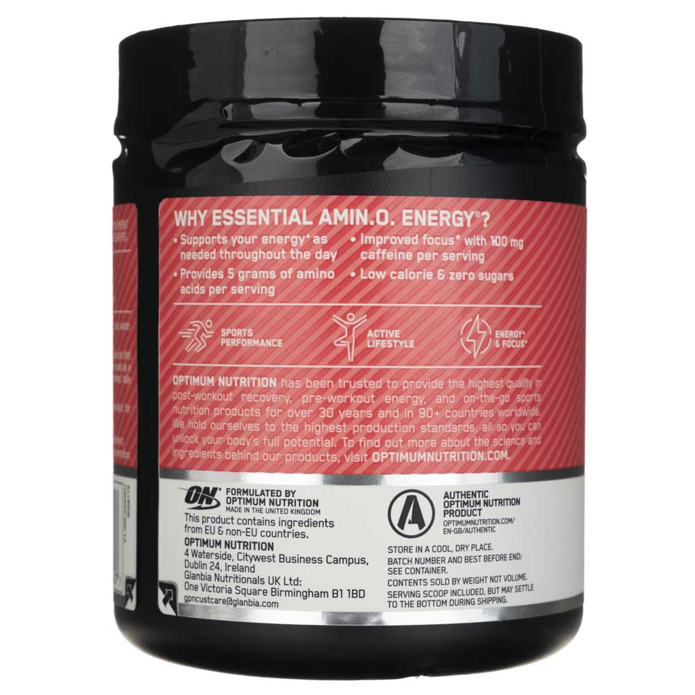Essential Amin.O. Energy by Optimum Nutrition, är ett kosttillskott i pulverform med smak av vattenmelon som innehåller snabbabsorberande aminosyror.