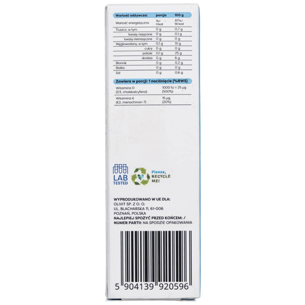 Kosttillskott med vitamin D3 (kolekalciferol) och vitamin K2 (menakinon-7). Oral spray med xylitol (med sötningsmedel) och naturlig pepparmyntaarom.