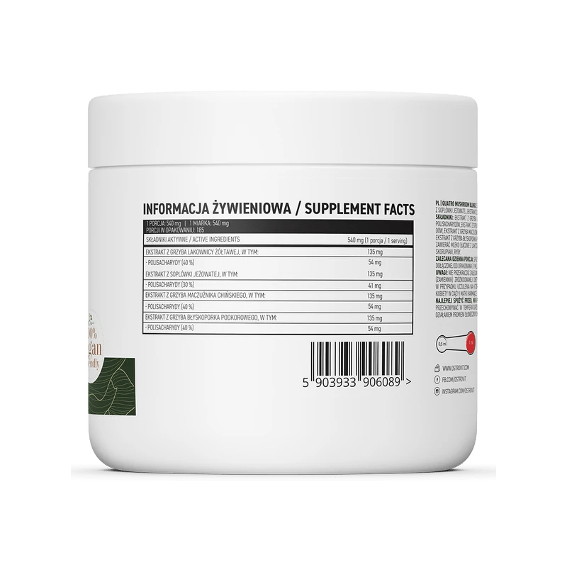 Ostrovit Quatro Mushroom Blend Vege är en unik kombination av extrakt från fyra olika svampar - gul spetssvamp, konvalj, kinesisk muskotblomma och subklavisk spindelskivling. Det är en beredning som finns i en bekväm pulverform, skapad för människor som bryr sig om att komplettera sin kost med naturliga, värdefulla ingredienser. Beredningen är vegansk, utan onödiga tillsatser.