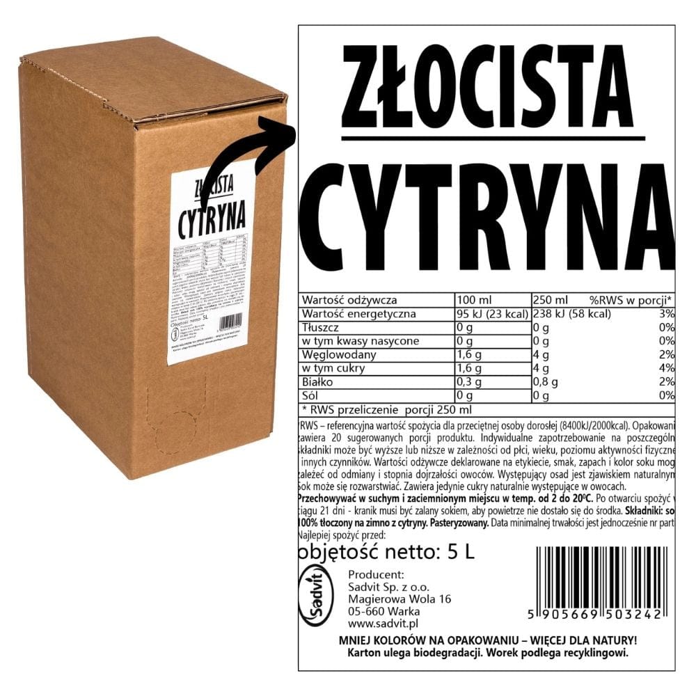 Sadvit Lemon Juice Golden Lemon 100% är NFC (, inte från koncentrat), kallpressad juice som endast innehåller citroner. Pastöriserad, utan tillsats av socker eller smakförstärkare.