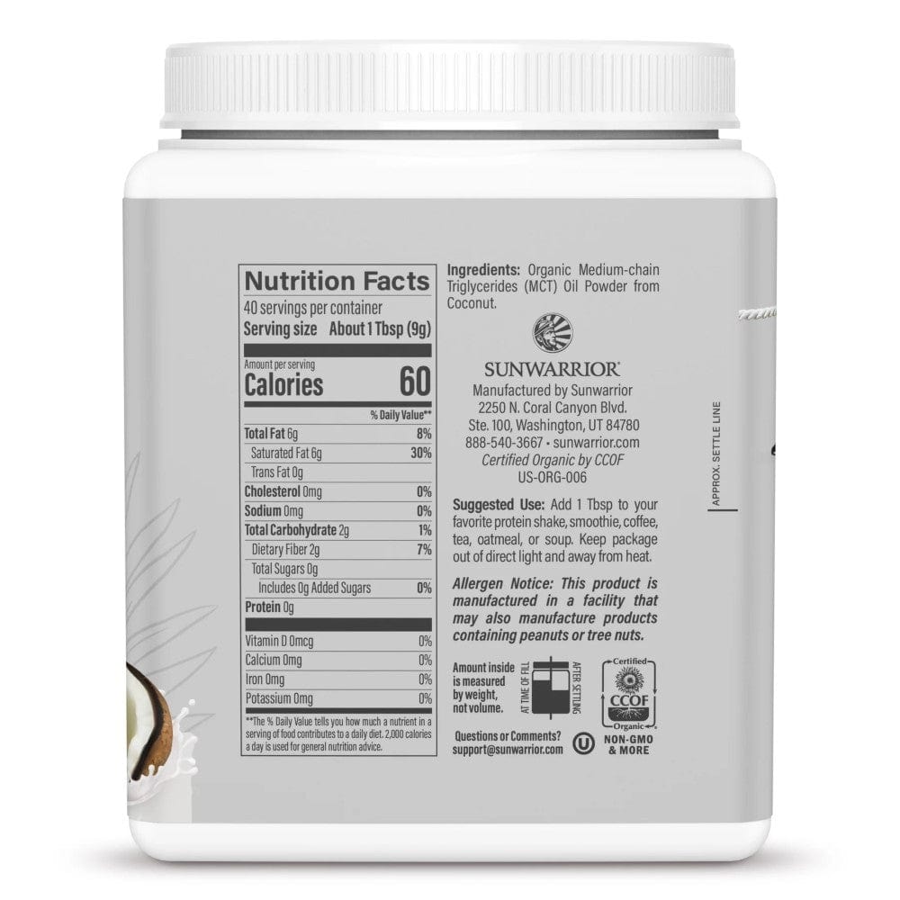 Sunwarrior Active MCT Oil är en pulverformel som innehåller ekologisk, pulveriserad kokosnötsolja. Vegansk, utan onödiga tillsatser och fyllnadsmedel.
