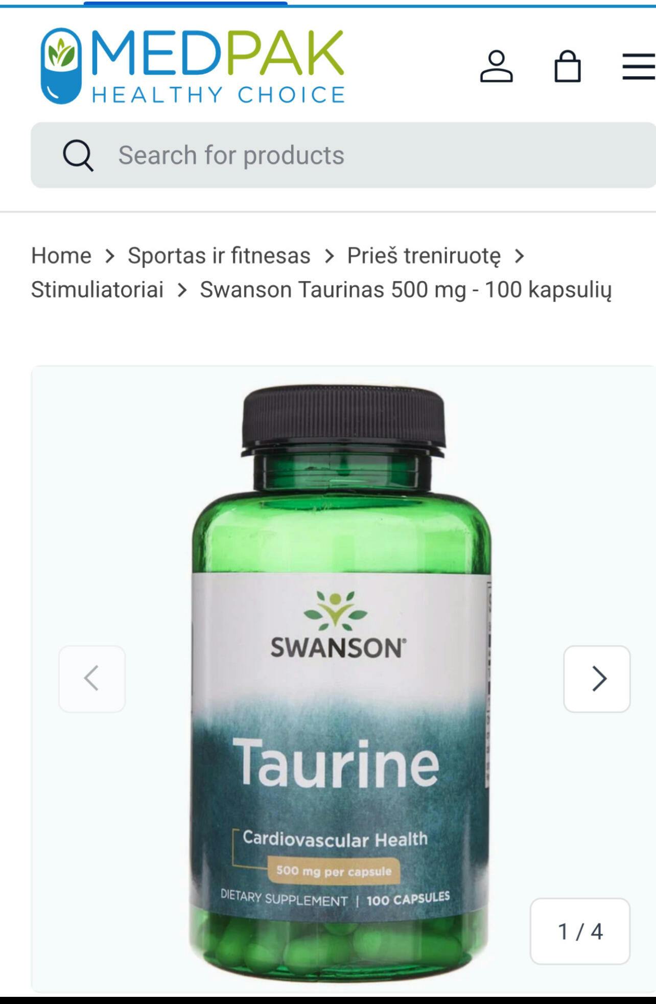 Taurin av Swanson är ett kosttillskott i kapslar som innehåller taurin. Preparatet Swanson Taurin innehåller 500 mg av den aktiva substansen i en kapsel.