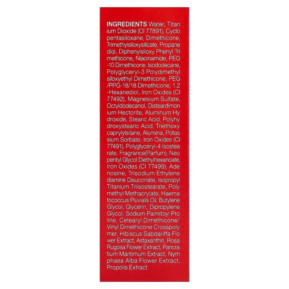 Vatten, titandioxid (ci 77891), cyklopentasiloxan, dimetikon, trimetylsiloxisilikat, propandiol, difenylsiloxifenyl trimetikon, niacinamid, peg -10 dimetikon, isododekan, polyglyceryl-3 polydimetylsiloxietyl dimetikon, peg /ppg-18/18 dimetikon,1,2 -hexandiol, järnoxider (ci 77492), magnesiumsulfat, oktyldodekanol, disteardimoniumhektorit, aluminiumhydroxid, stearinsyra, polyhydroxistearinsyra, trietoxikaprylylsilan, aluminiumoxid, kaliumsorbat, järnoxider (ci 77491), polyglyceryl-4 isostearat, doft (parfym), neopentylglykoldietylhexanoat, järnoxider (ci 77499), adenosin, trinatriumetylendiamindisuccinat, isopropyltitantriisostearat, polymetylmetakrylat, haematococcus pluvialis-olja, diamindisuccinat, isopropyltitantriisostearat, polymetylmetakrylat zxc133 diamin disuccinat, isopropyl titanium triisostearat, polymetylmetakrylat, haematococcus pluvialis olja, butylenglykol, glycerin, dipropylenglykol, natriumpalmitoyl pro line, cetearyldimetikon/vinyldimetikonkorspolymer, hibiscus sabdariffa-blomsterekstrakt, astaxantin, rosa rugosa-blomsterekstrakt, pancra tium maritimum-extrakt, nymphaea alba-blomsterekstrakt, propolis-extrakt.