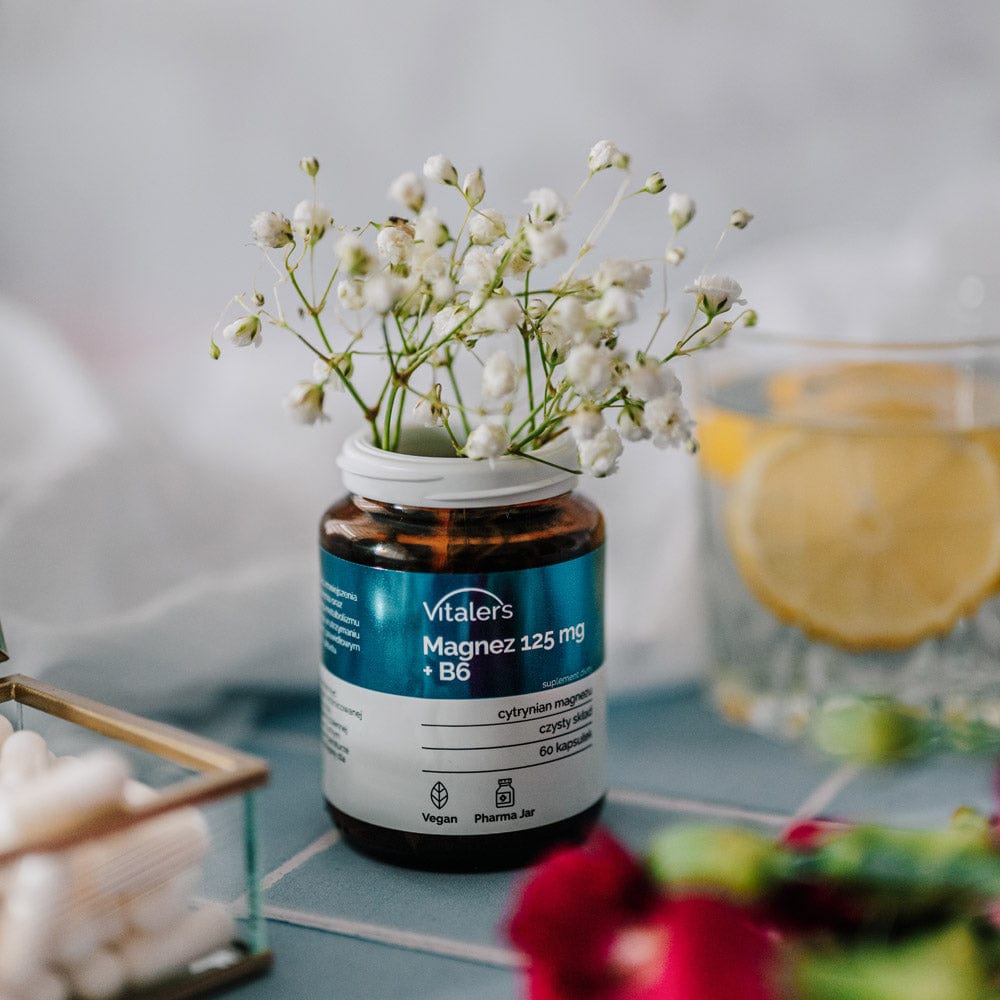 Vitaler's Magnesium 125 mg + B6 är ett kosttillskott som uppfyller riktlinjerna för en vegansk och vegetarisk kost. Tack vare vitamin B6 i produkten, ökar upptaget av magnesium från mag-tarmkanalen med 20-40%.